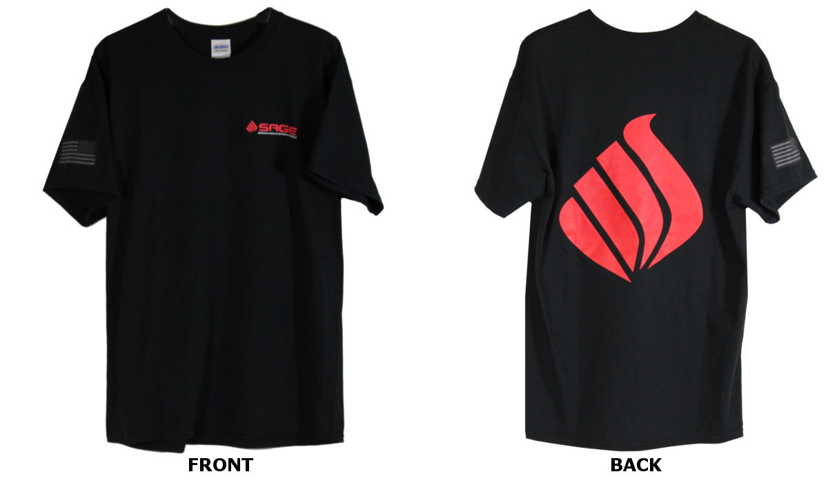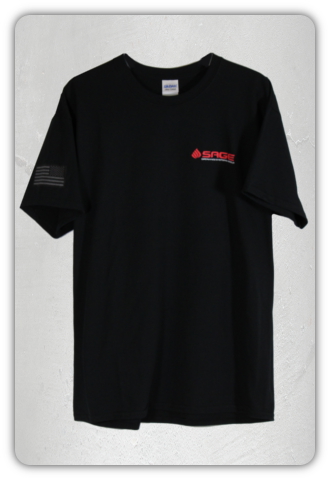 The BSSTS is a black short sleeve t-shirt featuring the SAGE company logo and SAGE decal on the back.